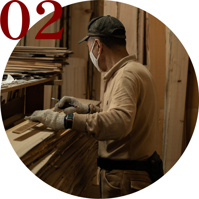 ⽊に合った型を選別し、墨打ち(印つけ)をします。⽊材に傷や節がある場合は、その場所を避けて⾏います。