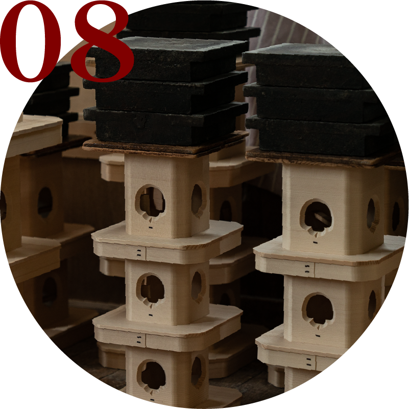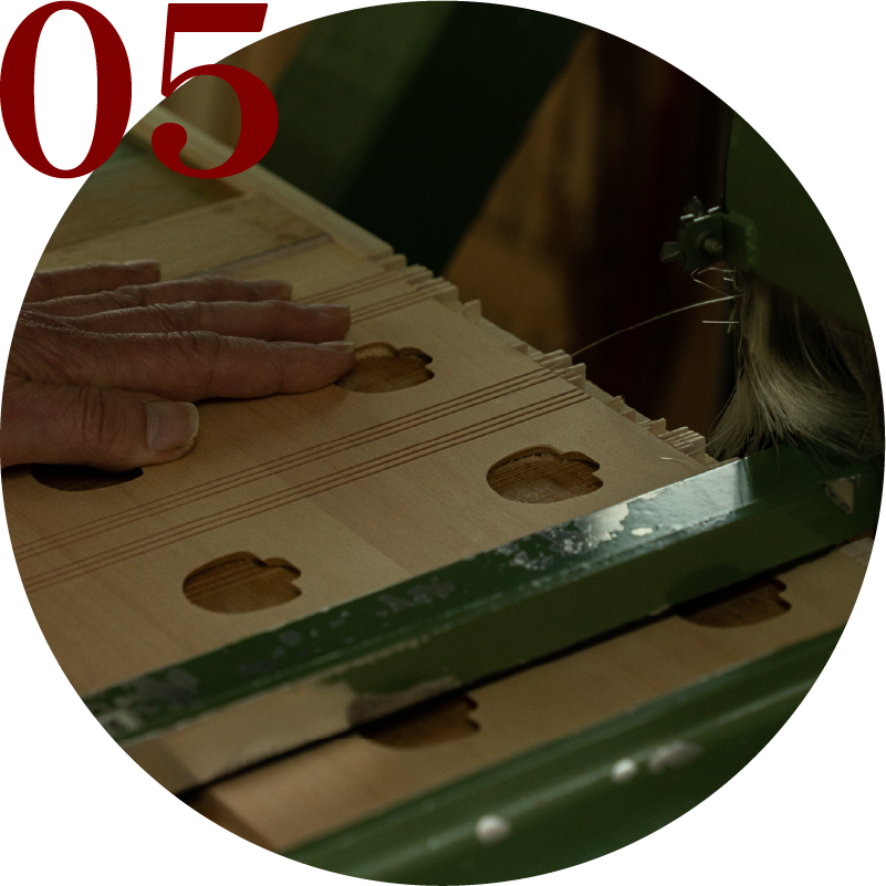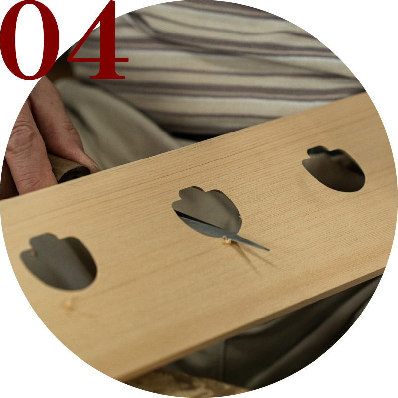 ⽳の切断⾯が⽑⽻⽴つため、職⼈が細部までを⼩⼑で仕上げます。