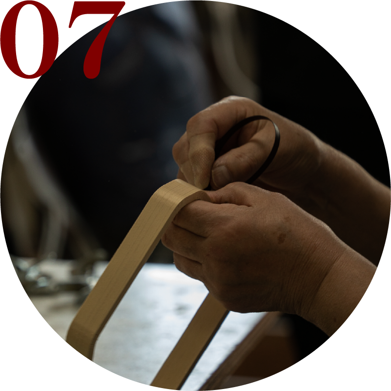 なめした⼭桜の⽪を端末に編み込んで綴じます。綴じ終えたら、余った⽪を切り落とします。
