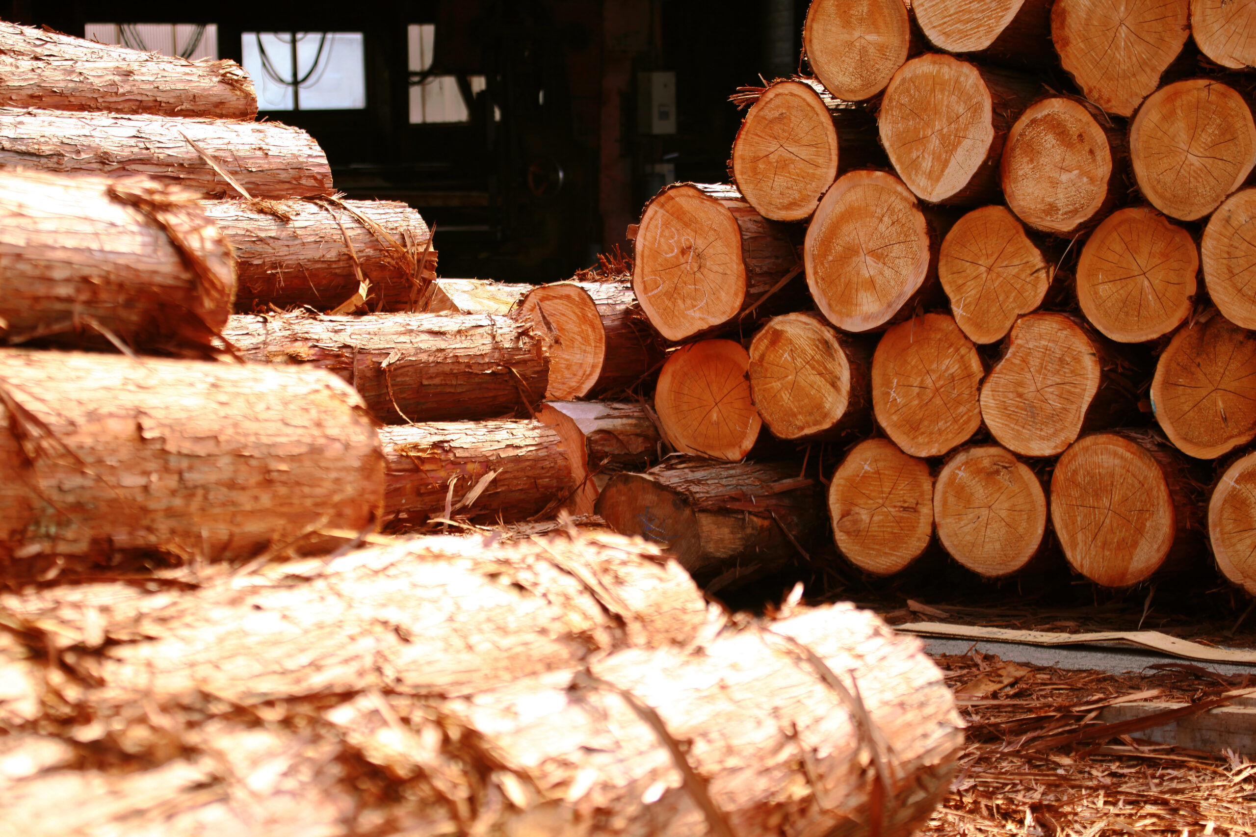 ⻑野県⽊曽原⽊場でヒノキを買付け。製材した丸太を、夏場は1週間、冬場には2週間かけて乾燥させます。